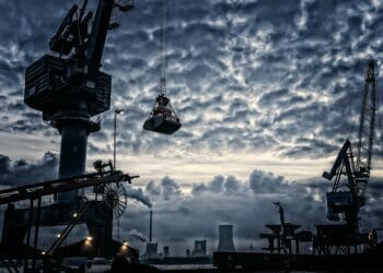 Red lights prick the dull Morning skyline, lined grey With worried looking clouds;